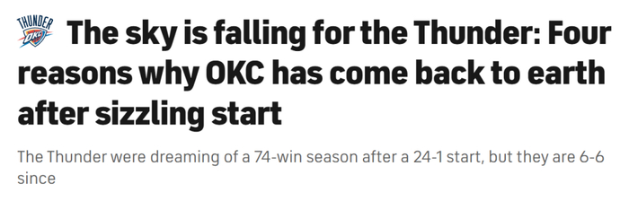 但眼下,俄克拉荷马城的天,似乎真的要塌了,所有人都陷入了焦虑。知名美媒CBS深入剖析雷霆队近期战绩滑坡的原因,细数那些可能阻碍他们卫冕之路的短板——